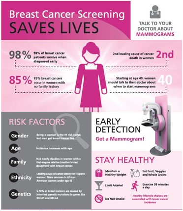 October is a good reminder to learn more about breast cancer, the risk factors, and the importance of being screened for the disease. It is important to conduct regular breast self-exams on a monthly basis. It may not be the most reliable method to detect breast cancer, but it is important for your breast health. By conducting monthly self-exams, you will be able to detect if there is a change. Early detection is key!